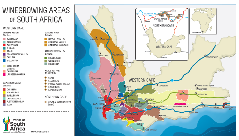 De wijnproductie bevindt zich bijna geheel in de Westkaap, hoewel er inmiddels in sommige andere provincies ook op beperkte schaal geproduceerd wordt. De productie is verdeeld over meerdere wijngebieden met ieder zijn eigen klimaat en grondsoorten. De kern wordt gevormd door Stellenbosch en Franschhoek. Daar bevinden zich verreweg de meeste wijnhuizen en concentreert zich het wijntoerisme. Maar daarnaast zijn er nog vele andere interessante wijngebieden zoals Constantia (het oudste gebied), Paarl, Wellington, het gebied rondom Robertson, Swartland in het noorden, de Karoo en het nieuwere gebied Walker Bay and Bot Rivier (in de buurt van Hermanus). De belangrijkste druivensoorten zijn Chenin Blanc, Colombard, Cabernet Sauvingon, Sauvignon Blanc, Shiraz, Chardonnay, Pinotage en Merlot.